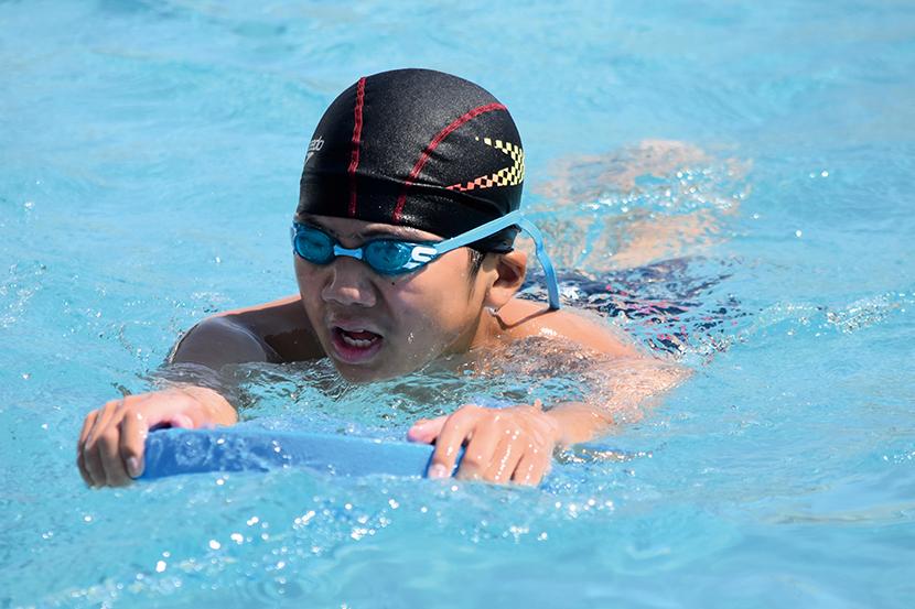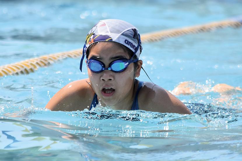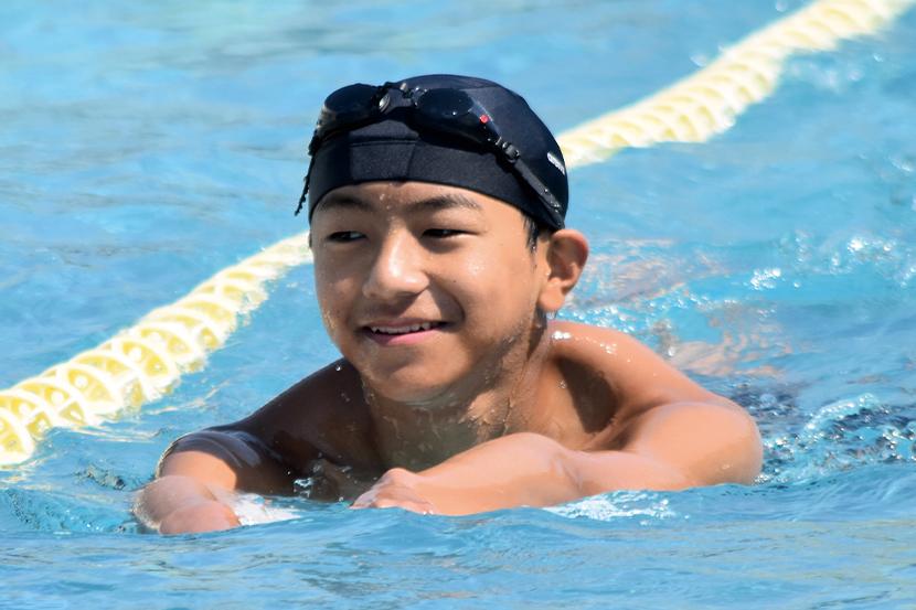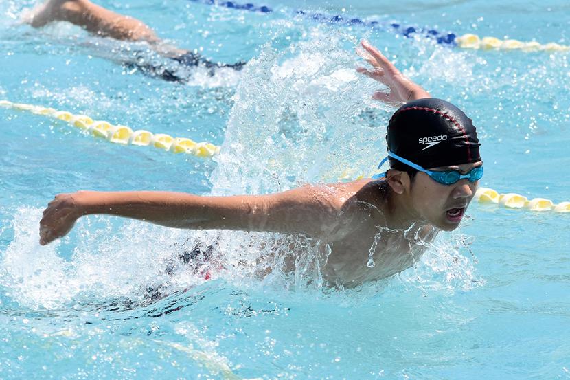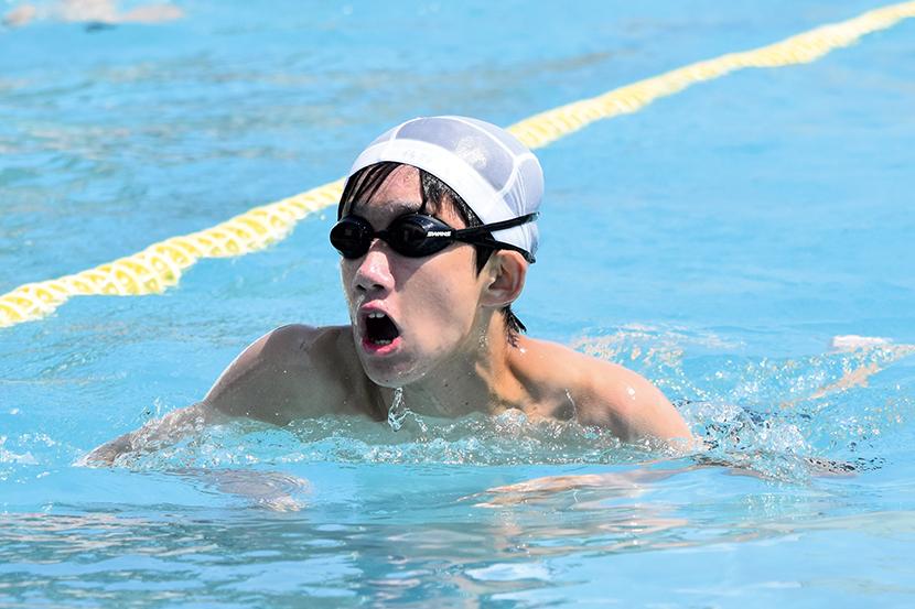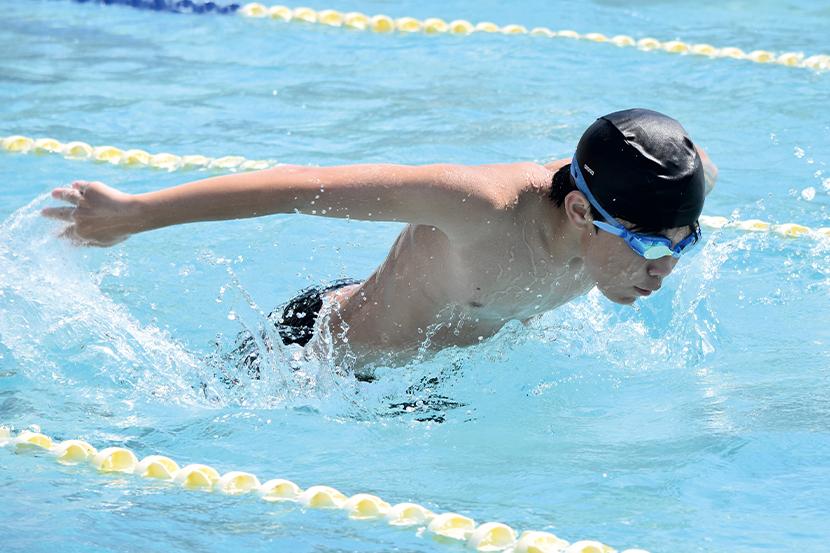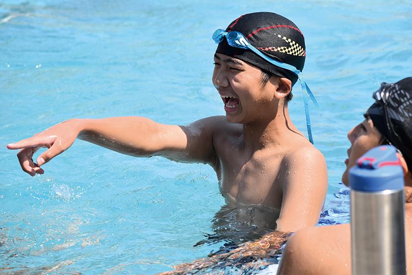 男子キャプテンの金城琉愛くんは「クロール100mが種目。バタ足を一定のリズムで続けられるように意識して泳いでいる。みんな優しくて、一緒に頑張る気持ちを上げてくれる子が多い」と話し、女子キャプテンの三浦大空さんは「水泳は個人種目が多いけど、リレーや練習では仲間を思い合うことができるところが好き。平泳ぎでは焦らずにしっかりと伸びることを意識している。最後の大会が近いので、自己ベストやより高い順位を目指して練習に励んでいきたい」と話してくれた。