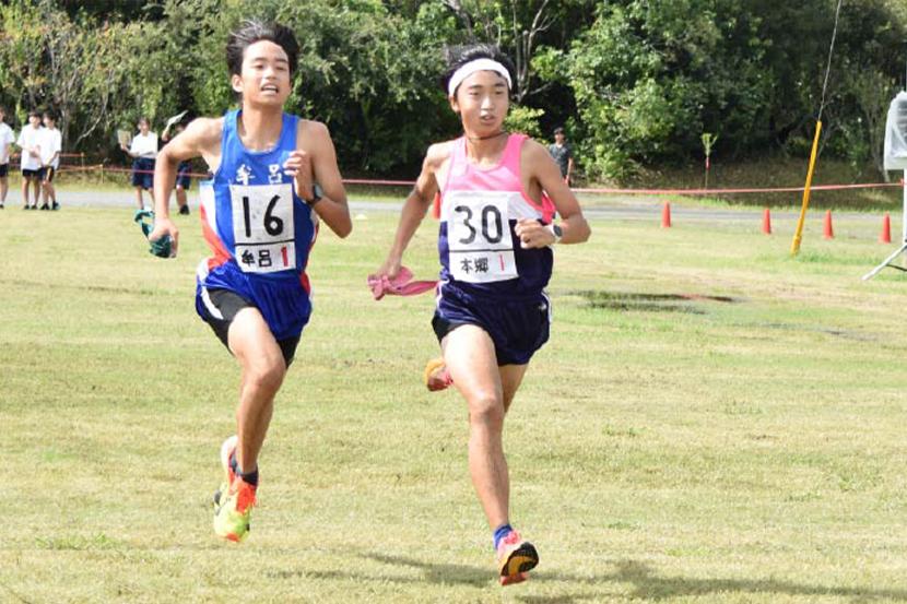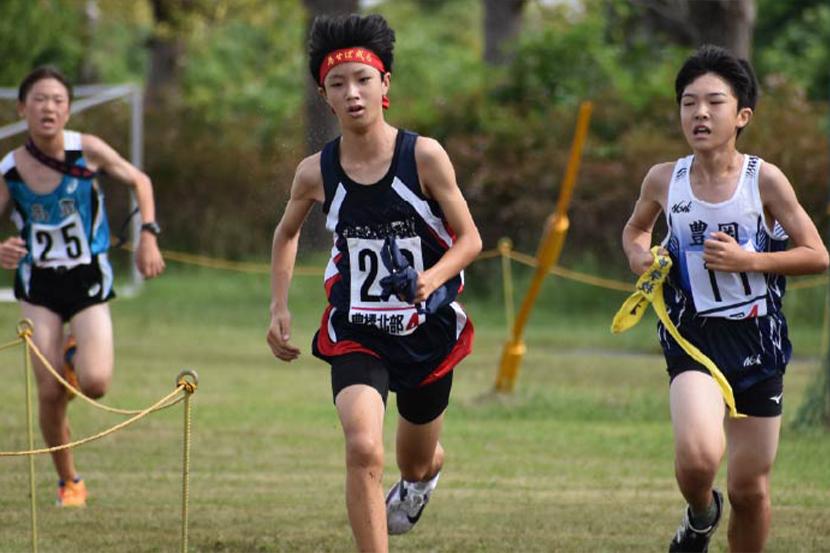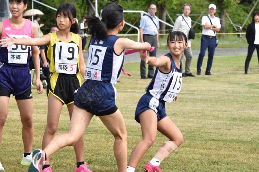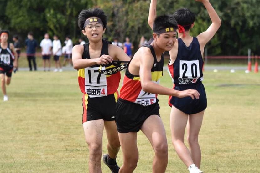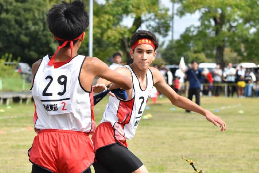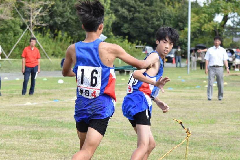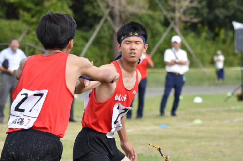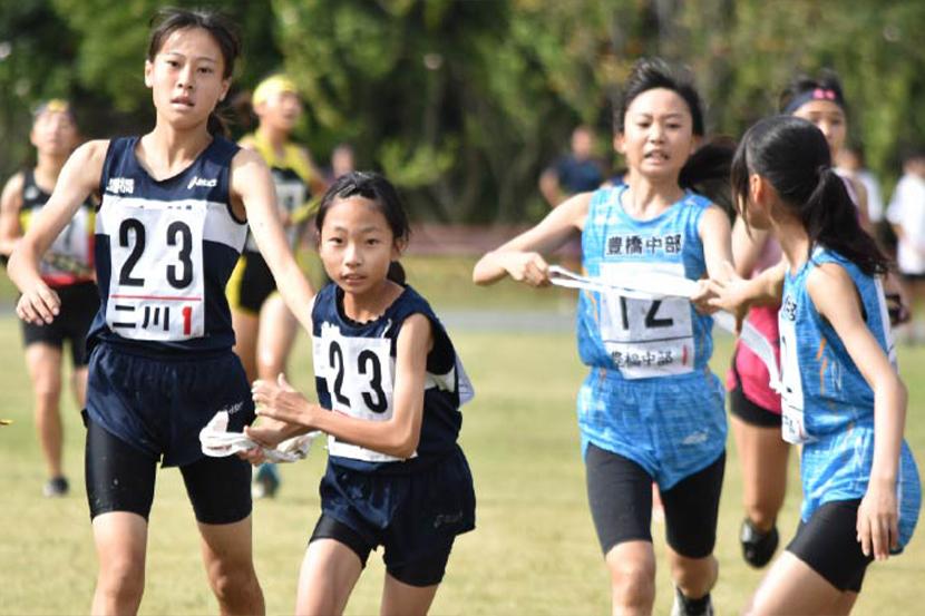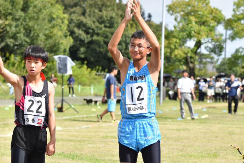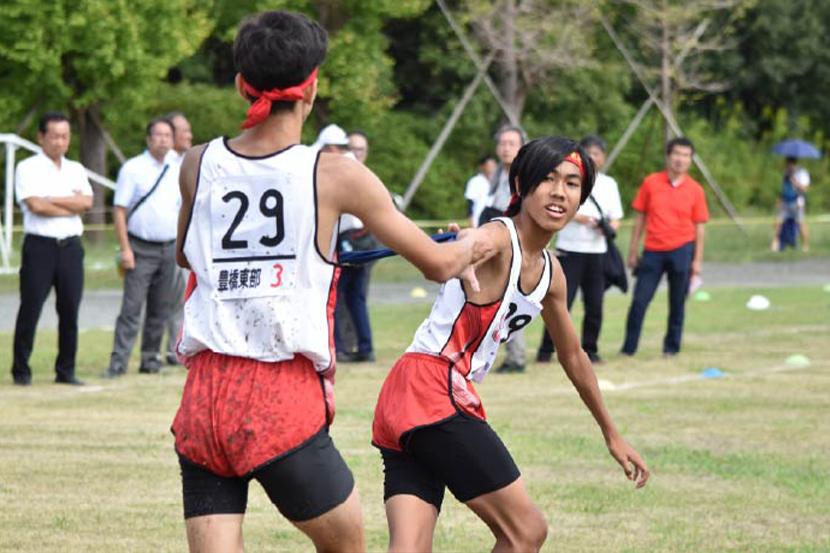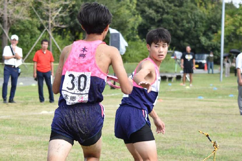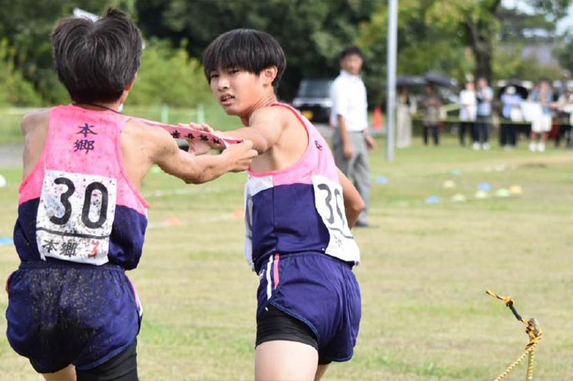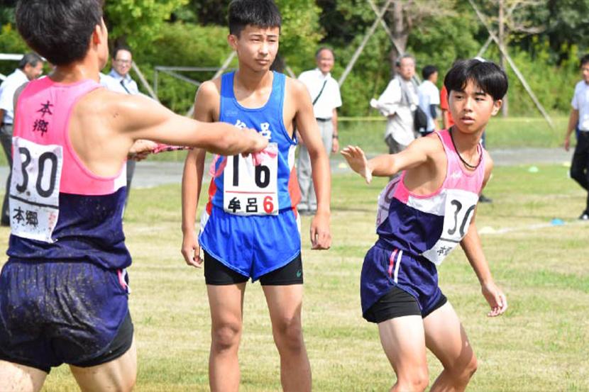 続いて男子の部。本来であれば14・75kmの区間を走るのだが、会場のコンディションの影響もあり、女子と同じ11・4kmのコースでスタートした。トラックを集団で出ていき、先頭で戻ってきた牟呂中・本郷中が襷を渡す瞬間までデットヒートし、ほぼ同時に2走がスタート。2区の勝者は本郷中。2位は集団で牟呂中・二川中がほぼ同時にスタート。順位が