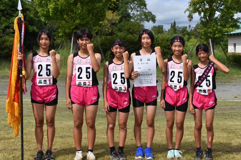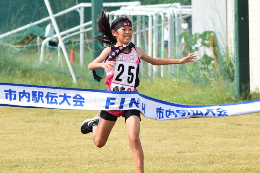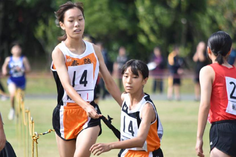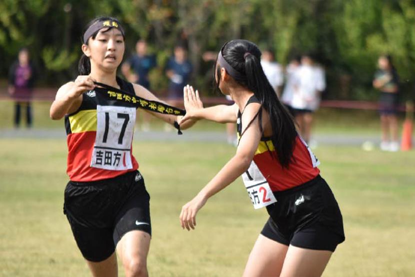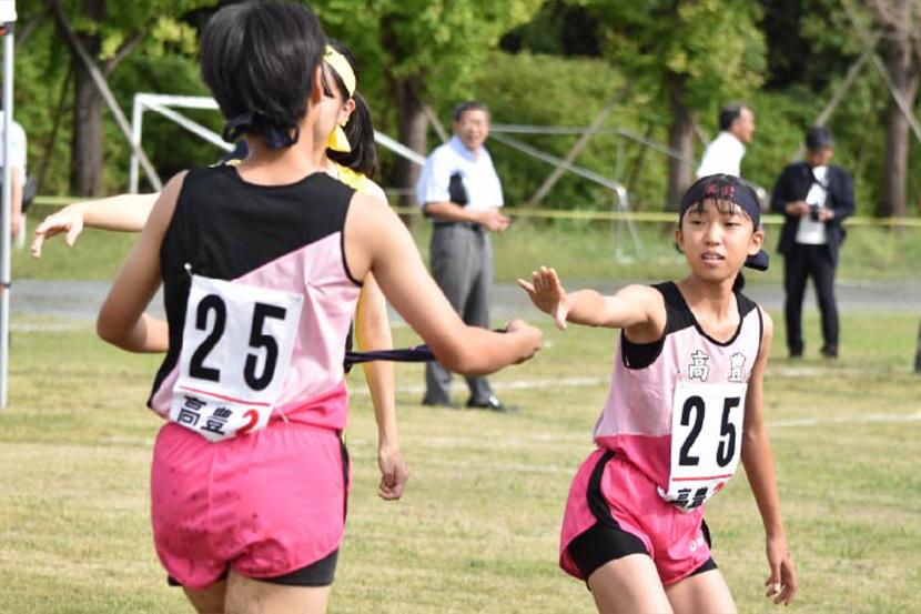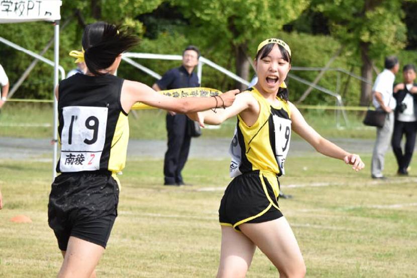 まず女子の部がスタートすると、地面の水を飛ばしながら集団でトラックを駆け抜けた。1番最初に戻ってきたのは青陵中。そのまま青陵中がトップのまま襷をつなぎ、優勝するかと思われた。しかし、着々と青陵中の背中を追いかけてきた高豊中が4区でトップへ。5区で青陵中がトップへ返り咲き、両者譲らず、拮抗した状態で6区のアンカー勝負へ。勝利を掴み、ゴールテープを切ったのは、高豊中だった。高豊中1区を走った2年生の赤星夢來さんは「先頭について走り、上位で襷を渡せるようなプランを考えていて、実行できたのでよかった。辛くなったときはレース前に、チームで思いを書き合った手の甲を見て最後まで走り切ることができた」1年生ながら6区アンカーを務めた松井愛來さんは「アンカーを任されて緊張したけど、先生やメンバーが信じてくれたから頑張ることができた。一定のペースで走って、最後に加速できるように考えて走り、1番にゴールテープを切ることができた」と話してくれた。