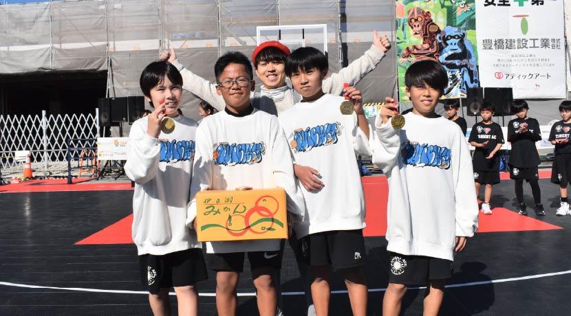 小学生の部は、4年生以上からエントリーが可能で6チームが集まった。女子だけのチームも健闘を見せるなど大いに盛り上がりを見せた。決勝トーナメントに上がったのは、4チーム。準決勝で勝利を収めたのは、接戦を制したFBアトラス覚醒と女子チームに力の差を見せつけたスーパーマン。決勝は互いに良いディフェンスをみせ、後半までロースコアの展開でOTまでもつれた。2点先取のOTで試合を決めたのはFBアトラス覚醒。森下くんの2ポイントシュートで優勝を飾った。